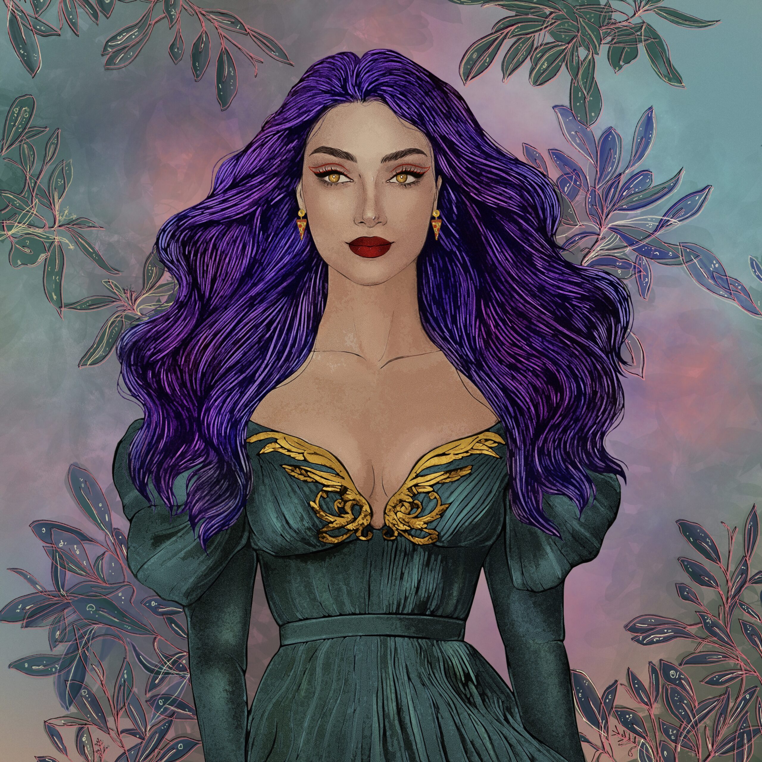 Roya refers to her art practice as one that conveys freedom and powerful emotions. The symbolic forms of freedom are clear to see through the wings of butterfly, the free flowing hair and the often cosmically arranged portraits.