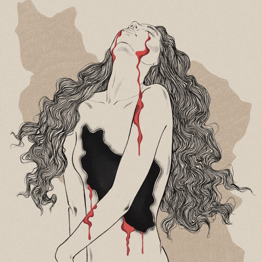 "She never looked away. Tears streaming down her cheek, filling the dark places inside with the blood of the mother. Flowers grow here, deep inside her heart. Her eyes wide open, pierce through the veil and fixate on the horizon. She knows where she is going, she knows who she is, she asks not for permission and lives beyond regrets. Look into her depths, what do you see?"