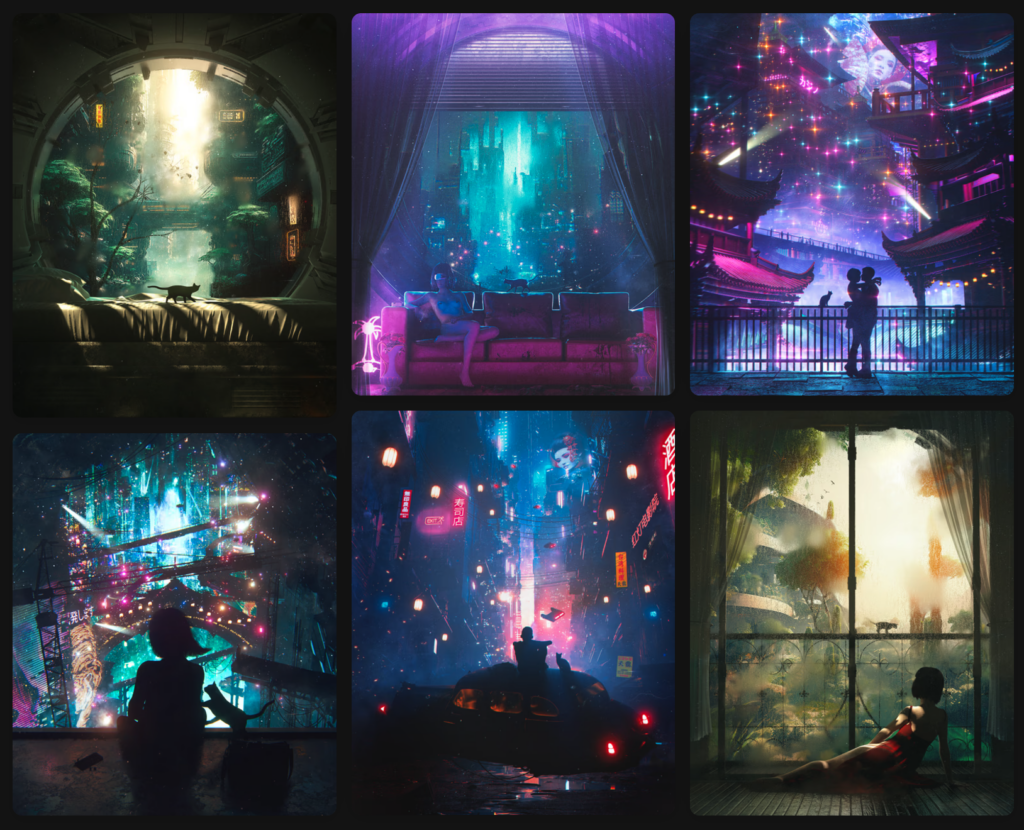 Five of the six artworks are low editions, with one open edition (top left) titled 'A Breathe of Fresh Air.' The signature teal Dangiuz applies liberally mediates the mood of the collection. The highlights of magentas and reds give focus for the viewer on the neon beauty of the cities AI will inevitably build for us. Perhaps Dangiuz on-chain artwork may inspire an automaton of the future to buidl our skyscrapered homes.