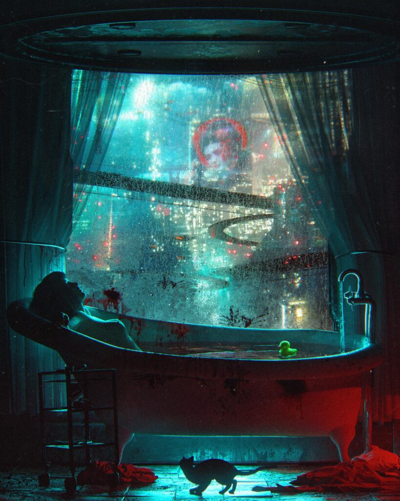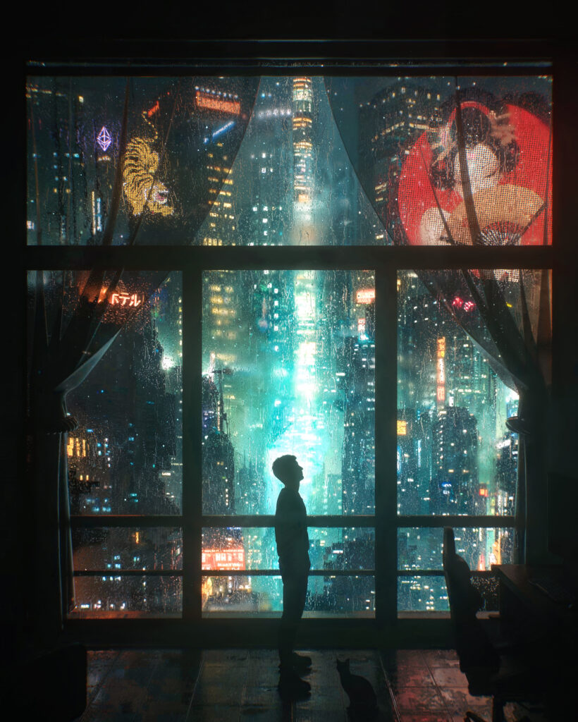 Romantic Cyberpunk artist Danguiz, hurtles us into the future to ponder what it might mean to exist in the 22nd Century and beyond. With Blade Runner four decades in an our rear vision mirror, many dystopian aspects of its forecast have already come to pass. Yet there is hope within the scenes Dangiuz creates. The cat reminds us that we still care for the animals, despite an inundation of super-sized pixel displays.