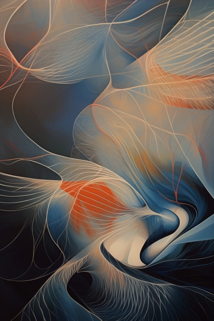 TOCO DECO | Line 731"Elegant transitions of blue, white, orange, and black converge upon the plane, blending together in a choreography of hues and delicate lines. The interplay between the line-work and an undulating composition unfurls a visual narrative with profound fluidity. Within this symphony of aesthetics, a seamless fusion of colors, lines, and textures harmonize, weaving a tapestry evoking a transcendent connection with the artwork's beauty.: