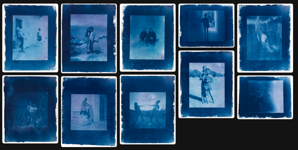 "The cyanotypes were 10 mistakes that i accidently put black and white film in the 4x5 film holders on 10 different twin shoots. Then realized I can make alternative prints with cyanotype procesing to make the mistake into something resourceful."