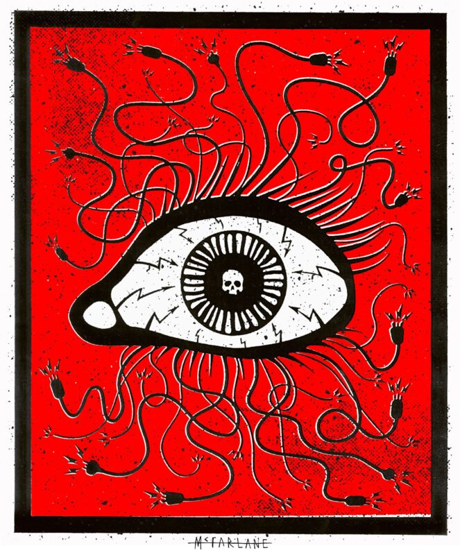 Imagery Electrifies rearranges the lighting rod iconography we saw in The Hammer and points them inwards towards the whites of a helpless eye. Again the shrapnel covered red background communicating what damage imagery can inflict.